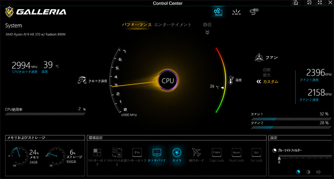 搭載しているCPU(Ryzen AI 9 HX 370)はパワーを出すと高い消費電力となるが、本機には静音(省電力)モードがあり、パワーを抑えて静かに長時間動かすこともできる。